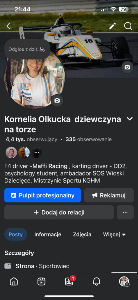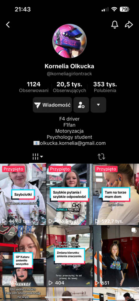 Gromadzę wokół siebie w mediach społecznościowych aktywną, zaangażowaną społeczność, która może liczyć nie tylko na content z toru i z życia kierowcy – wykorzystując storytelling, publikuję także materiały edukacyjne, zachęcając do spełniania marzeń oraz motywując do nieustannego rozwoju.